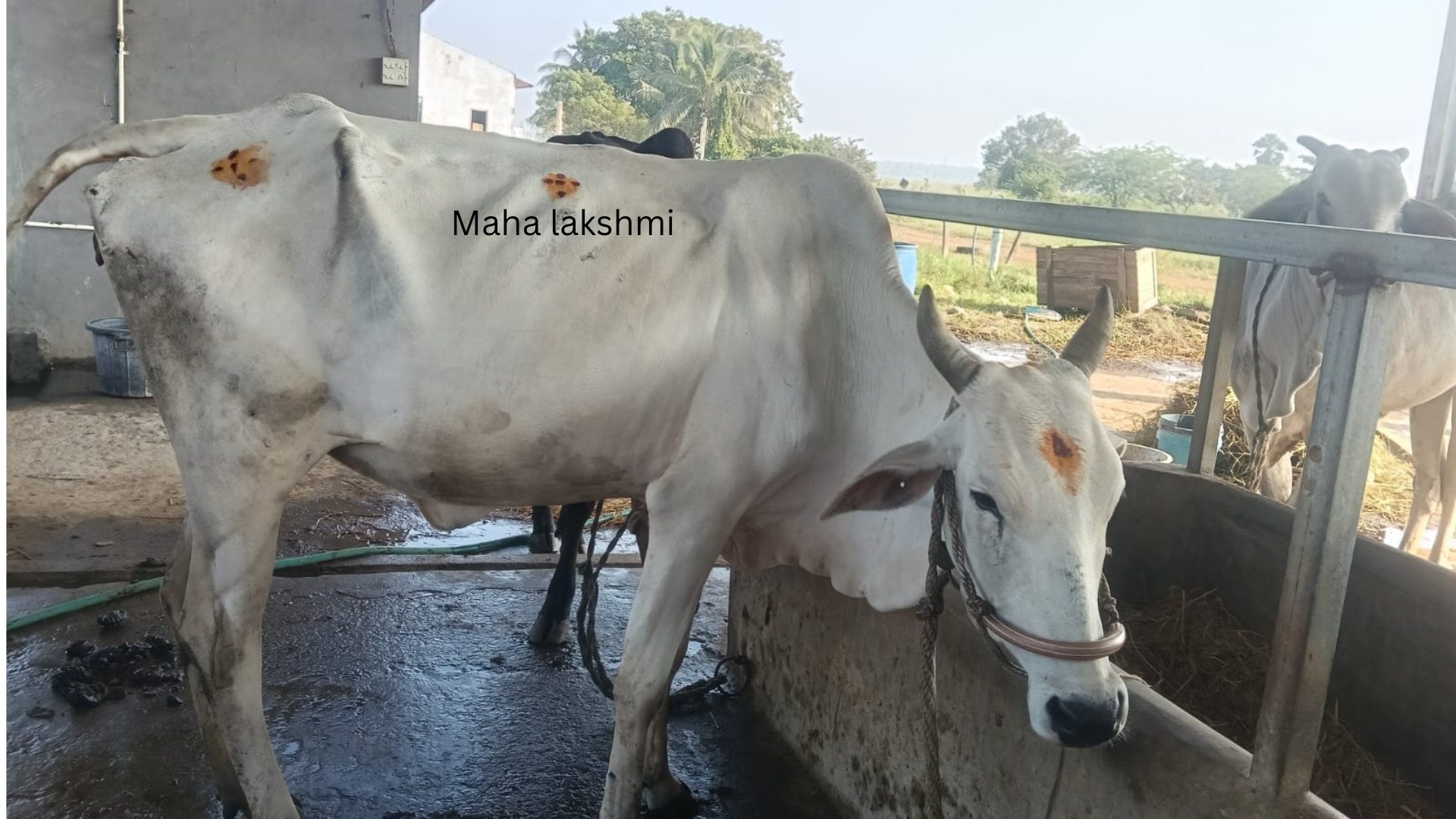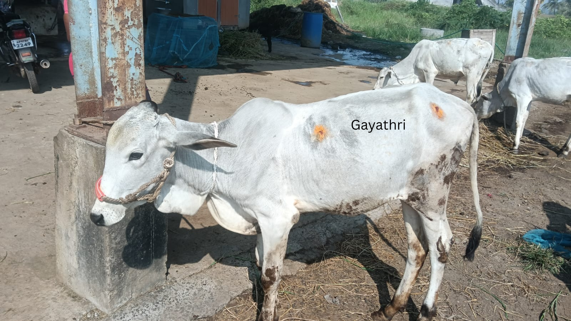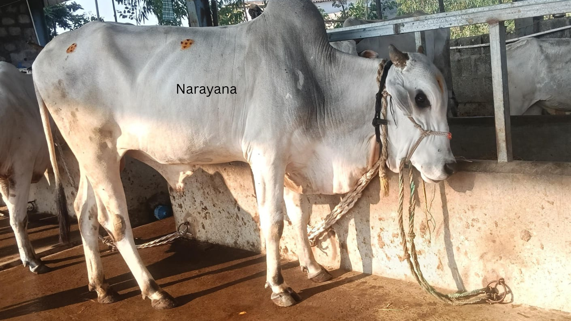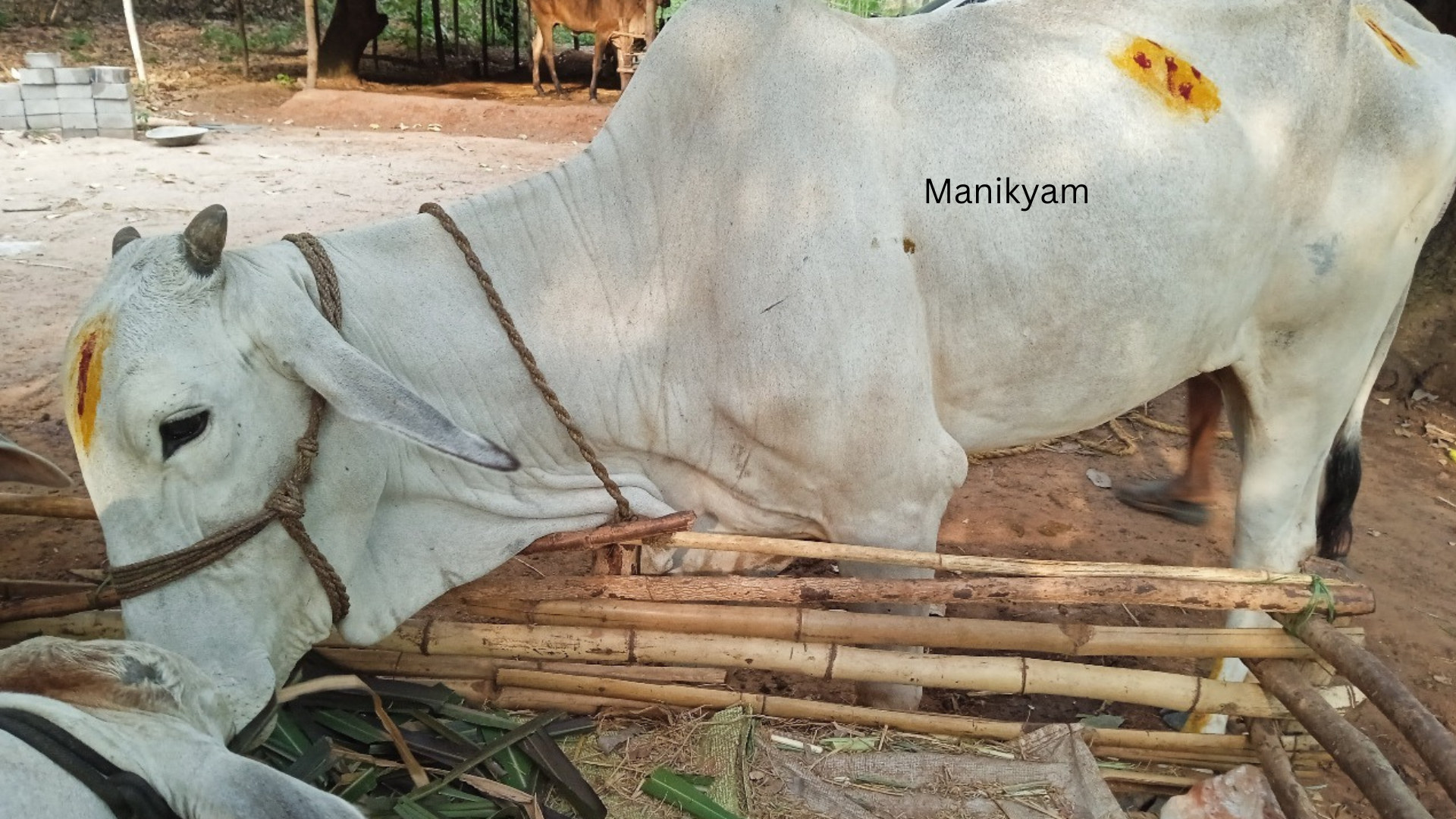 The fertile cow, very gentle to its humans but dominates other cows, the tamer of Manikyam. She is mother of Narayana, our other bull. Her spine is little long compared to others. She takes care of her babies very well. She is the first one to shout if the feed gets late or if she would like to go out for grazing. We are blessed that she is currently 5 months into her pregnancy.