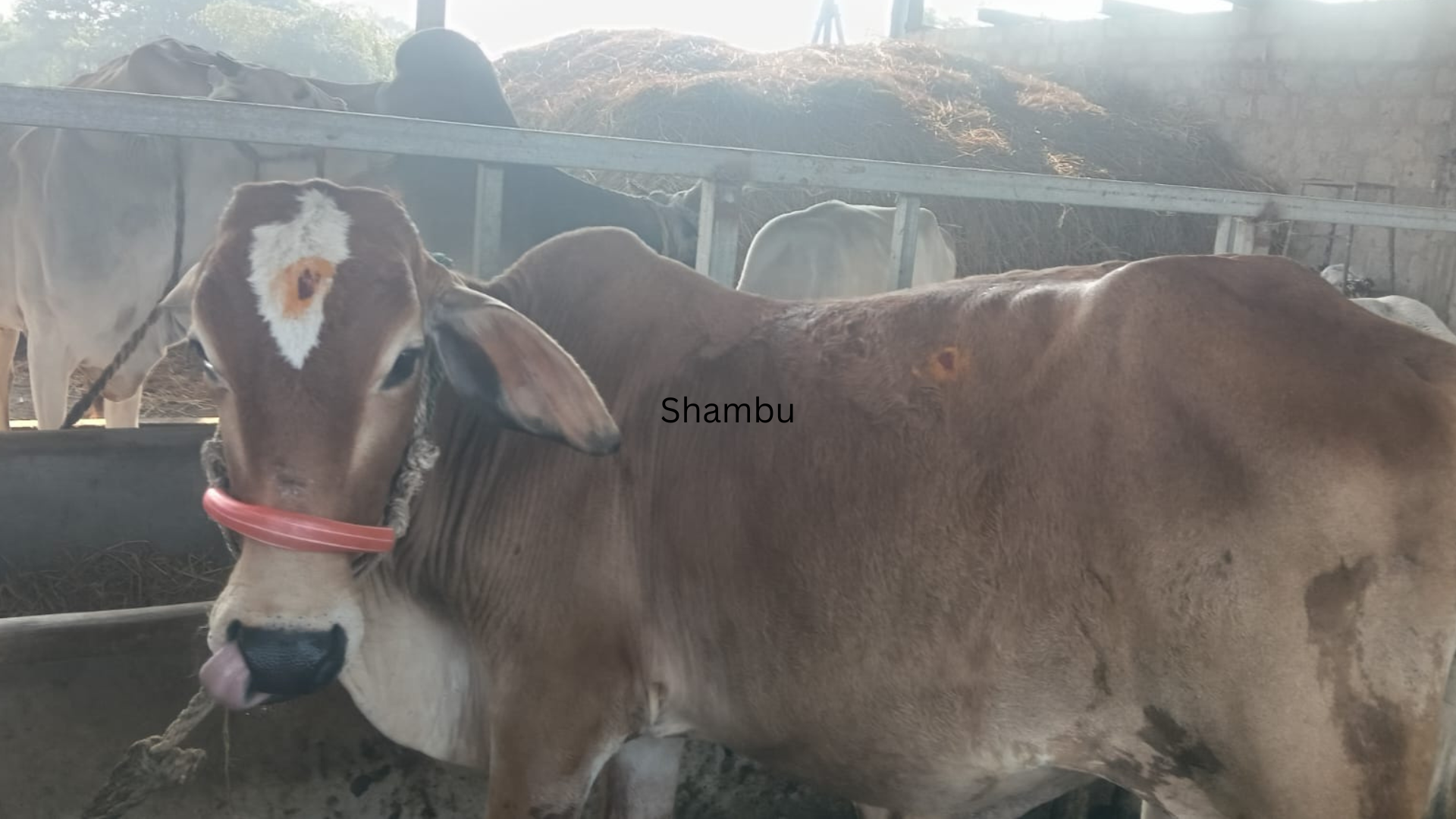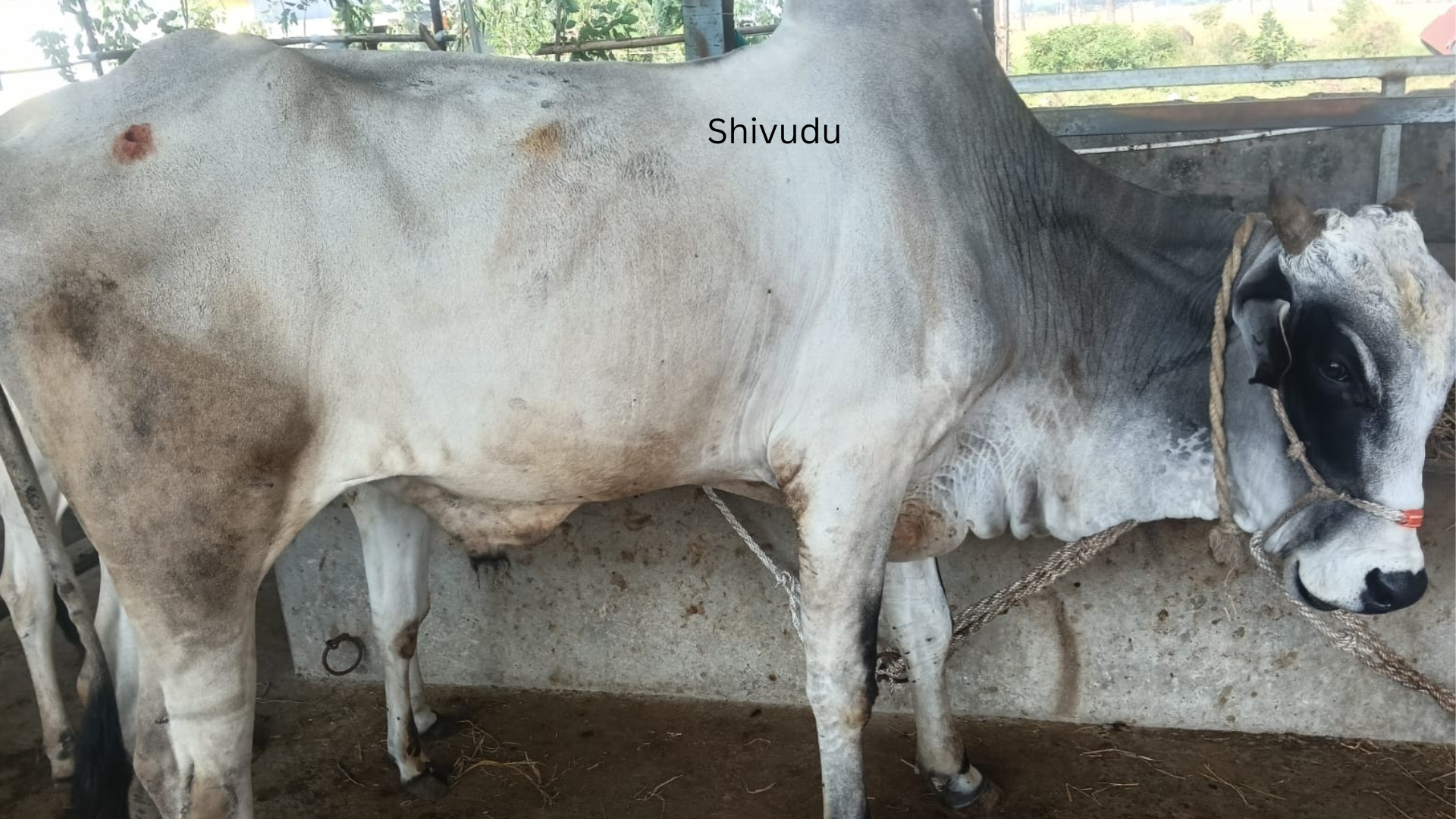 The big gentle bull, very fond of green grass, cooked cereals and dhals. When we used to bring the cooked food near, he would shake his head as if to say "give it to me, give it to me". During mating season his testosterone would go so high it would not let anyone come near him. He makes his eye huge and roars with a tremendous sigh when he is ready to gore. When they are free grazing, some other outside bulls would come for a fight and he would throw them in the air and they would run off. Shivudu is a fighter, the protector of the herd.