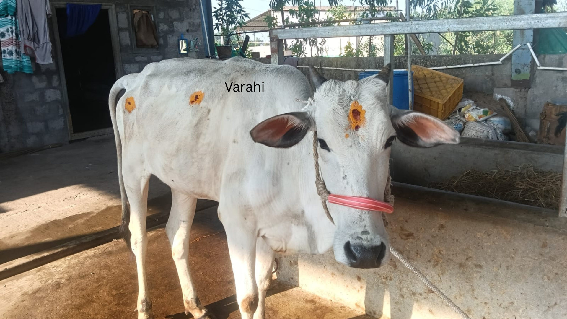Born to Gowthami on Sunday, named after Sun Deity, she is very gentle cow and loves to be petted and fed bananas. Her mother licks her so much out of love. She used to be in a hurry to get untied for drinking milk in the morning. She looks exactly like her mother.